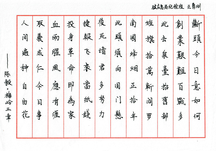 硬笔书法比赛活动提升了青年纪检监察干部的政治素质,培养了年轻人良好的书写习惯。全体青年纪检监察干部以此次活动为契机,深入学习贯彻党的二十大精神,在写中学、在学中干,以实际行动推动党的二十大精神落实见效。