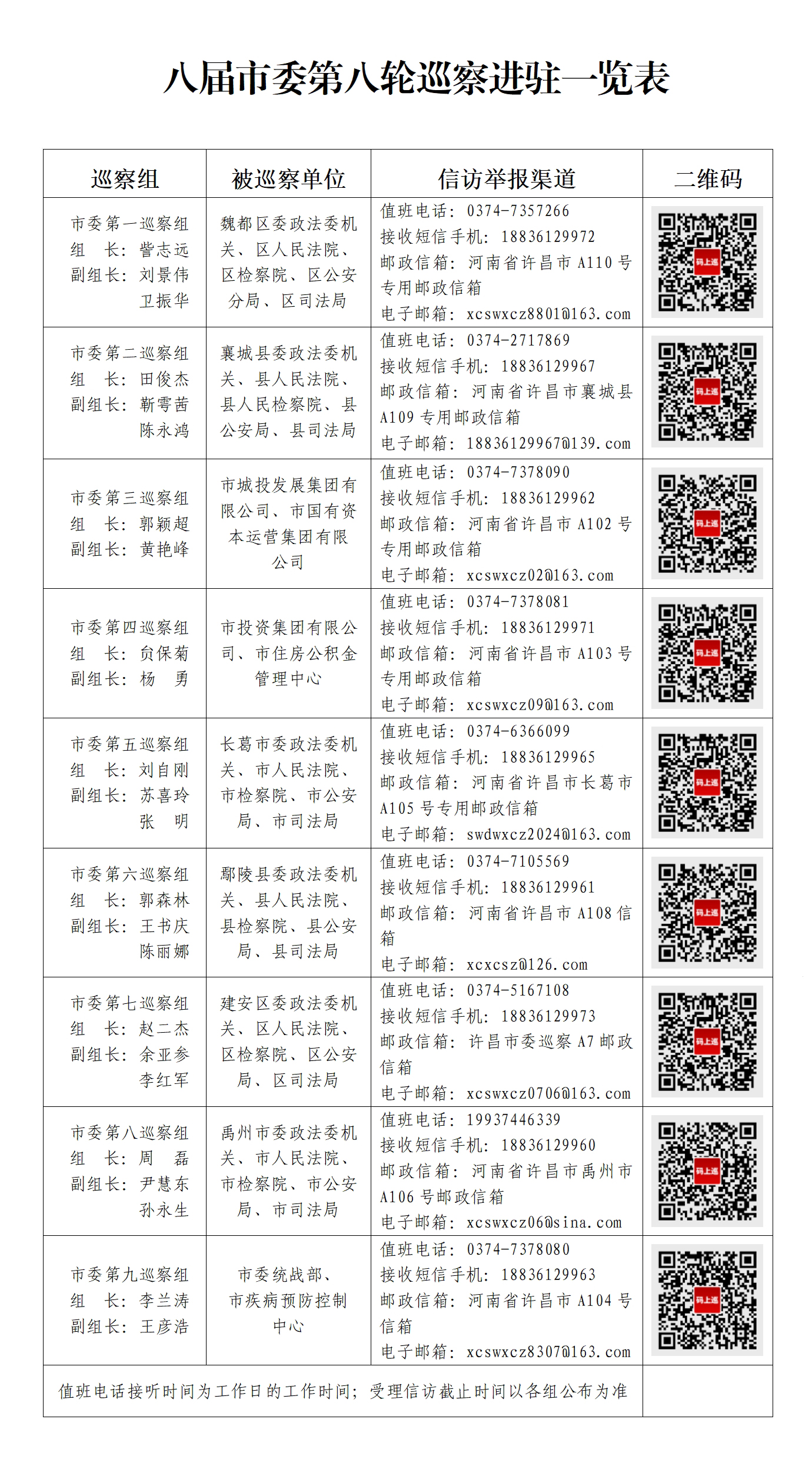 本轮巡察同步开展选人用人、意识形态工作责任制等专项检查,同时加强与审计监督联动贯通,时间50天左右。为便于干部群众反映情况,市委巡察组设置专门值班电话、专用邮政信箱及二维码等,主要受理反映被巡察党组织领导班子及其成员,下一级党组织主要负责人和关键重要岗位干部问题的来信来电来访。对不属于巡察受理范围的涉法涉诉、个人利益诉求等问题,按规定移交有关部门处理。
